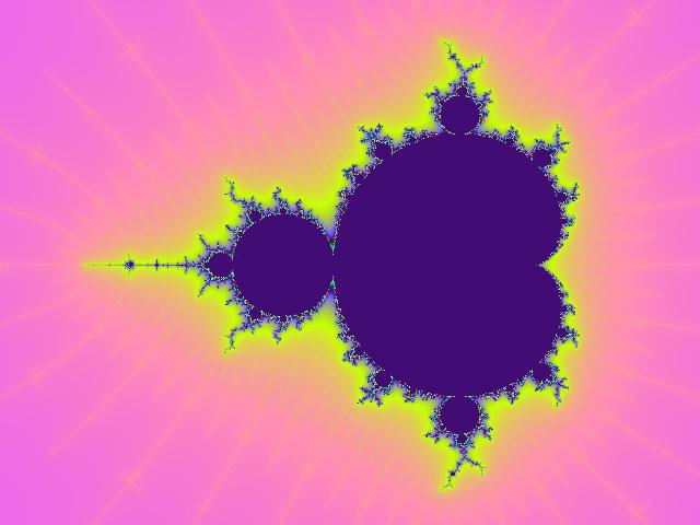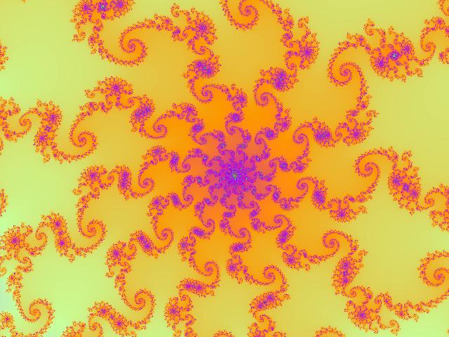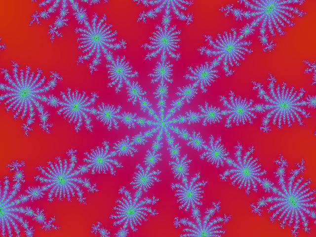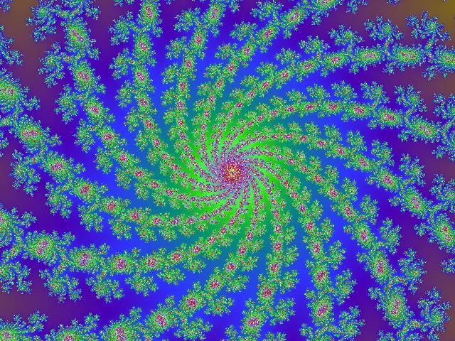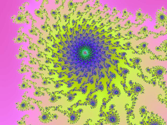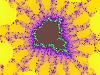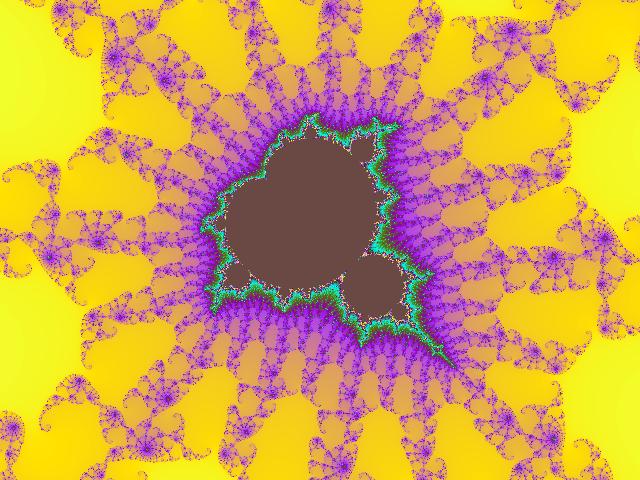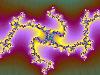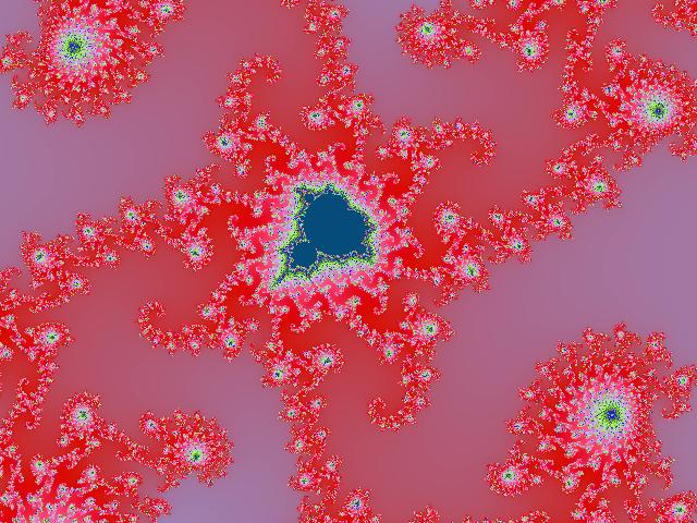 Below are just a few images of parts of the Mset. Click on the images to see the full size images. All the images are 640 by 480 pixel JPEG images. Below each thumbnail, the three numbers indicate the 'zoom' factor based on the 4.0x4.0 top level image of the Mset, and the coordinates of the centre of the image within the Mset. All the images were generated with the extremely adaptable Flarium24 version 8.7 developed by Stephen C. Ferguson
